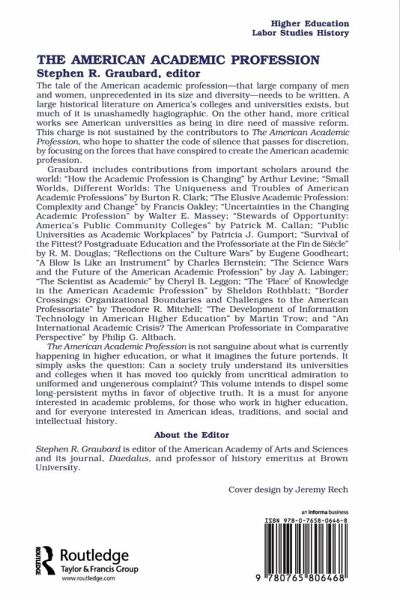 "This book covers well the issues and problems of the U.S. academic profession in the second half of the twentieth century." -- Contemporary Science The tale of the American academic profession-that large company of men and women, unprecedented in its size and diversity-needs to be written. A large historical literature on America's colleges and universities exists, but much of it is unashamedly hagiographic. On the other hand, more critical works see American universities as being in dire need of massive reform. This charge is not sustained by the contributors to The American Academic Profession, who hope to shatter the code of silence that passes for discretion, by focusing on the forces that have conspired to create the American academic profession.Graubard includes contributions from important scholars around the world: "How the Academic Profession is Changing" by Arthur Levine; "Small Worlds, Different Worlds: The Uniqueness and Troubles of American Academic Professions" by Burton R. Clark; "The Elusive Academic Profession: Complexity and Change" by Francis Oakley; "Uncertainties in the Changing Academic Profession" by Walter E. Massey; "Stewards of Opportunity: America's Public Community Colleges" by Patrick M. Callan; "Public Universities as Academic Workplaces" by Patricia J. Gumport; "Survival of the Fittest? Postgraduate Education and the Professoriate at the Fin de Sibcle" by R. M. Douglas; "Reflections on the Culture Wars" by Eugene Goodheart; "A Blow Is Like an Instrument" by Charles Bernstein; "The Science Wars and the Future of the American Academic Profession" by Jay A. Labinger; "The Scientist as Academic" by Cheryl B. Leggon; "The 'Place' of Knowledge in the American Academic Profession" by Sheldon Rothblatt; "Border Crossings: Organizational Boundaries and Challenges to the American Professoriate" by Theodore R. Mitchell; "The Development of Information Technology in American Higher Education" by Martin Trow; and "An International Academic Crisis? The American Professoriate in Comparative Perspective" by Philip G. Altbach.The American Academic Profession is not sanguine about what is currently happening in higher education, or what it imagines the future portends. It simply asks the question: Can a society truly understand its universities and colleges when it has moved too quickly from uncritical admiration to uniformed and ungenerous complaint? This volume intends to dispel some long-persistent myths in favor of objective truth. It is a must for anyone interested in academic problems, for those who work in higher education, and for everyone interested in American ideas, traditions, and social and intellectual history.Stephen R. Graubard is editor of the American Academy of Arts and Sciences and its journal, Daedalus, and professor of history emeritus at Brown University.