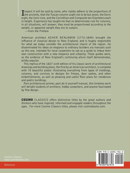 American architect ASHER BENJAMIN (1773-1845) brought the influence of classical design to New England, and is hugely responsible for what we today consider the architectural charm of the region. He disseminated his ideas on elegance to ordinary builders via manuals such as this one, intended for local carpenters to use as a guide to imbue their own construction with a new elegance and urbanity. These guides were, as the evidence of New England's continuing allure itself demonstrates, wildly popular. This replica of the 1827 sixth edition of his classic work of architectural drawings and building plans, the first by an American architect, is complete with 70 beautiful plates illustrating everything from types of moldings, columns, and cornices to designs for friezes, door sashes, and other embellishments, as well as pleasing and useful floor plans for residences and public buildings. Part architectural primer, part do-it-yourself manual, this timeless work will delight students of architect, hobby carpenters, and anyone fascinated by fine design.