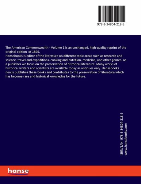 The American Commonwealth - Volume 1 is an unchanged, high-quality reprint of the original edition of 1895.Hansebooks is editor of the literature on different topic areas such as research and science, travel and expeditions, cooking and nutrition, medicine, and other genres. As a publisher we focus on the preservation of historical literature. Many works of historical writers and scientists are available today as antiques only. Hansebooks newly publishes these books and contributes to the preservation of literature which has become rare and historical knowledge for the future.