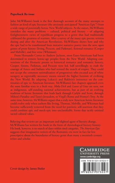 John McWilliams's 1990 book was the first thorough account of the many attempts to fashion an epic literature (the anxiously anticipated 'American Epic') from a wide range of potentially heroic New World subjects. At the outset, McWilliams considers the many problems - cultural, political and literary' - of adapting Enlightenment views of republican progress to a genre that had traditionally celebrated the greatness of warriors. After a survey of the many epic poems written during and after the American Revolution, McWilliams shows how and why the epic had to be transformed from imitative narrative poetry into the new, open genres of prose history (Irving, Prescott and Parkman), fictional romance (Cooper and Melville) and free verse (Whitman). Believing that reviews are an important and slighted agent of literary change, McWilliams has written his book in the form of chronological literary history. His book, however, is no march of dates within tired categories. The American Epic suggests that imaginative writers of the Romantic era were in fact far less proscriptive about the boundaries of literary genre than many a twentieth-century writer and scholar.