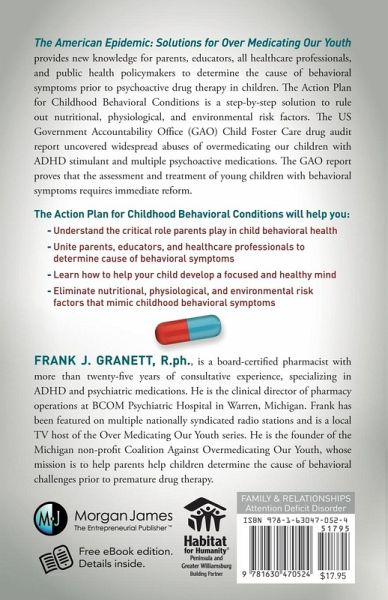 Introduction Chapter 1 The Family Unit Chapter 2 Evolution of the Behavioral Health Crisis in America Chapter 3 ADHD and Autism Risk Factors Chapter 4 Attention Deficit Hyperactivity Disorder: Americäs Epidemic Chapter 5 Plan of Correction: Pharmacists and Physicians Lead to Protect Children Chapter 6 Solutions for Americäs Epidemic Chapter 7 Suicide Prevention Chapter 8 How to Develop a Healthy Mind Chapter 9 Psychological and Alternative Bio-assessments Chapter 10 Leaders Must Lead Chapter 11 A New Vision Glossary References