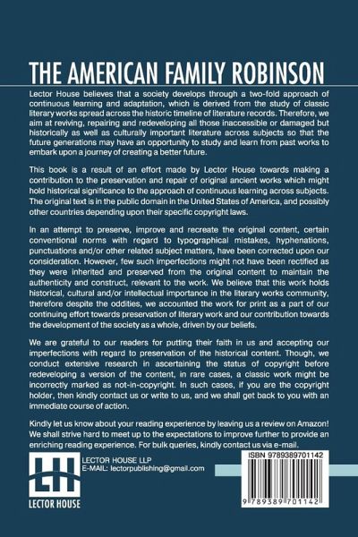 The American Family Robinson This book is a result of an effort made by us towards making a contribution to the preservation and repair of original classic literature. In an attempt to preserve, improve and recreate the original content, we have worked towards: 1. Type-setting & Reformatting: The complete work has been re-designed via professional layout, formatting and type-setting tools to re-create the same edition with rich typography, graphics, high quality images, and table elements, giving our readers the feel of holding a 'fresh and newly' reprinted and/or revised edition, as opposed to other scanned & printed (Optical Character Recognition - OCR) reproductions. 2. Correction of imperfections: As the work was re-created from the scratch, therefore, it was vetted to rectify certain conventional norms with regard to typographical mistakes, hyphenations, punctuations, blurred images, missing content/pages, and/or other related subject matters, upon our consideration. Every attempt was made to rectify the imperfections related to omitted constructs in the original edition via other references. However, a few of such imperfections which could not be rectified due to intentional\unintentional omission of content in the original edition, were inherited and preserved from the original work to maintain the authenticity and construct, relevant to the work. We believe that this work holds historical, cultural and/or intellectual importance in the literary works community, therefore despite the oddities, we accounted the work for print as a part of our continuing effort towards preservation of literary work and our contribution towards the development of the society as a whole, driven by our beliefs. We are grateful to our readers for putting their faith in us and accepting our imperfections with regard to preservation of the historical content. HAPPY READING!