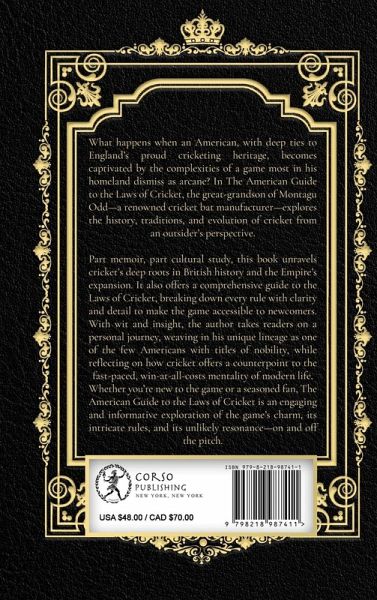 What happens when an American, with deep ties to England's proud cricketing heritage, becomes captivated by the complexities of a game most in his homeland dismiss as arcane? In The American Guide to the Laws of Cricket, the great-grandson of Montagu Odd-a renowned cricket bat manufacturer-explores the history, traditions, and evolution of cricket from an outsider's perspective. Part memoir, part cultural study, this book unravels cricket's deep roots in British history and the Empire's expansion. It also offers a comprehensive guide to the Laws of Cricket, breaking down every rule with clarity and detail to make the game accessible to newcomers. With wit and insight, the author takes readers on a personal journey, weaving in his unique lineage as one of the few Americans with titles of nobility, while reflecting on how cricket offers a counterpoint to the fast-paced, win-at-all-costs mentality of modern life. Whether you're new to the game or a seasoned fan, The American Guide to the Laws of Cricket is an engaging and informative exploration of the game's charm, its intricate rules, and its unlikely resonance-on and off the pitch.