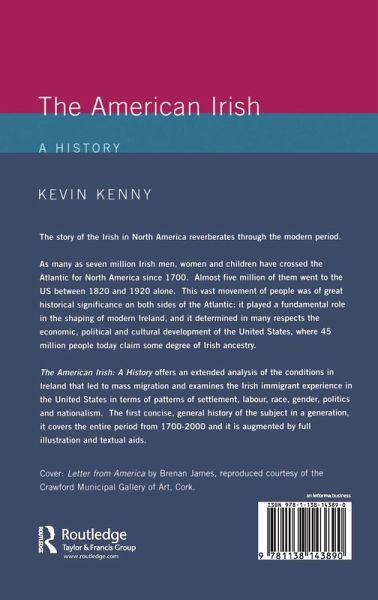 THE AMERICAN IRISH: A HISTORY The story of the Irish in North America reverberates through the modern period. As many as seven million Irish men, women and children have crossed the Atlantic for North America since 1700. Almost five million of them went to the US between 1820 and 1920 alone. This vast movement of people was of great historical significance on both sides of the Atlantic: it played a fundamental role in the shaping of modern Ireland, and it determined in mnay respects the economic, political and cultural development of the United States, where 45 million people today claim some degree of Irish ancestry. The American Irish: A History offers an extended analysis of the conditions in Ireland that led to mass migration and examines the Irish immigrant experience in the United States in terms of patterns of settlement, labour, race, gender, politics and nationalism. The first concise, general history of the subject in a generation, it covers the entire period from 1700-2,000 and it is augmented by full illustration and textual aids.