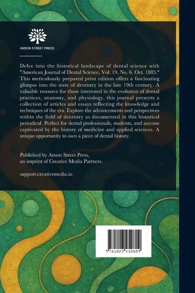 Delve into the historical landscape of dental science with "American Journal of Dental Science, Vol. 19, No. 6. Oct. 1885." This meticulously prepared print edition offers a fascinating glimpse into the state of dentistry in the late 19th century. A valuable resource for those interested in the evolution of dental practices, anatomy, and physiology, this journal presents a collection of articles and essays reflecting the knowledge and techniques of the era. Explore the advancements and perspectives within the field of dentistry as documented in this historical periodical. Perfect for dental professionals, students, and anyone captivated by the history of medicine and applied sciences. A unique opportunity to own a piece of dental history. This work has been selected by scholars as being culturally important, and is part of the knowledge base of civilization as we know it. This work is in the public domain in the United States of America, and possibly other nations. Within the United States, you may freely copy and distribute this work, as no entity (individual or corporate) has a copyright on the body of the work. Scholars believe, and we concur, that this work is important enough to be preserved, reproduced, and made generally available to the public. We appreciate your support of the preservation process, and thank you for being an important part of keeping this knowledge alive and relevant.