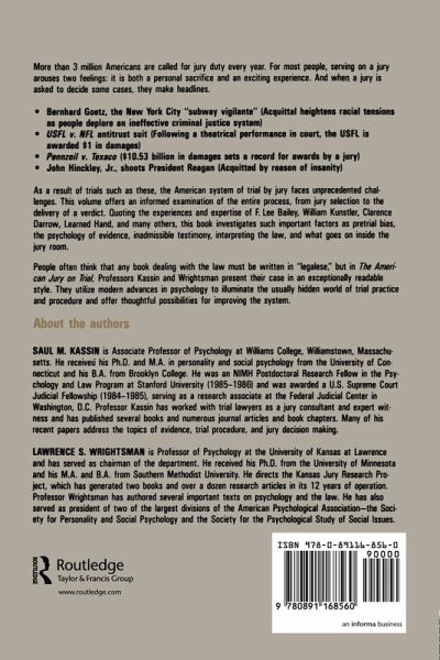 First Published in 1988. More than 3 million Americans are called for jury duty every year. For most people, serving on a jury arouses two feelings: it is both a personal sacrifice and an exciting experience. And where a jury is asked to decide some cases, they make headlines. As a result of trials such as these, the American system of trial by jury faces unprecedented challenges. This volume offers an informed examination of the entire process, from jury selection to the delivery of a verdict. Quoting the experiences and expertise of F. Lee Bailey, William Kunstler, Clarence Darrow, Learned Hand, and many others, ttis book investigates such important factors as pretrial bias, the psychology of evidence, inadmissible testimony, interpreting the law, and what goes on inside the jury room. People often think that any book dealing with the law must be written in 'legalese' but in in this book, Professors Kassin and Wrightsman present their case in an exceptionally readable style. They utilize modern advances in psychology to illuminate the usually hidden world of trial practice and procedure and offer thoughtful possibilities for improving the system.