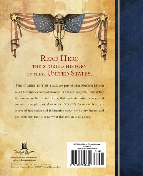 NEW YORK TIMES BESTSELLER Discover 365 reasons to love America as you read the storied history of the United States. The fife and drum of history mark the time of each passing day. And within their cadence, personalities, conflicts, discoveries, ideas, and nations peal and fade. American history is no different. Best-selling author and educator Dr. William J. Bennett is a master of the story that is the United States. In The American Patriot's Almanac, Bennett distills the American drama into 365 entries--one for each day of the year, with stories including: the starving time of Jamestown during the Winter of 1609 the bloody argument of the Civil War the invention of items such as Teflon The stories in this book are part of what Abraham Lincoln called the "mystic chords of memory." They are the symbols that define the essence of the United States, that mark its historic course, and connect its people. The American Patriot's Almanac is a daily source of inspiration and information about the history, heroes, and achievements that sum up what this nation is all about.