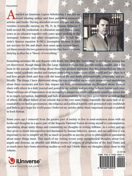 To call Einstein's famous equation E=MC2 incomplete because it does not account for life and death does seem quite extraordinary, yet these remain the two greatest mysteries they have ever been denying us thus far a "theory of everything." Something animates life and departs with death, but what this "something" is not all our science has yet discovered, though things like the Large Hadron Collider may provide needed insight, and it has been in the pursuit of knowledge about these two greatest mysteries that has compelled me into so many varied academic studies and careers attempting to make sense of the world and our place in it and how people think and deal with the issues of life and death philosophically, religiously, and politically. The things I have discovered along the way compelled me to much research and speculation about these mysteries and how they impact our lives, to communicate my thoughts about them to share with others in a daily journal and posted to my website and provided in book format each year. These writings are of importance in an increasingly dangerous world with a most uncertain future due to so much corruption, ineptitude and lack of accountability in our own government as well as that of others, the abject failure of our schools due to the very same things especially the same lack of accountability we find in government, the religious and political hatreds with protracted wars worldwide and little to give hope for world peace I believed my articles about these important enough to publish in book format. Some years ago I removed from the greater part of society to live in semi-seclusion alone with my books and thoughts in a quiet part of the Sequoia National Forest devoting myself to contemplation, speculating about many things and committing my thoughts in writing fulltime. As a writer and author given to much introspection and fascinated by human behavior, nature, and our universe it was important to me to simplify my life as much as possible as anyone given to philosophical speculation about many things must. That much of my writing covers some metaphysical thoughts about God, angels and demons, an afterlife and Biblical stories of origins, of prophecies of the End Times and so much more have been absorbing studies as well and I freely share my thoughts about these in this volume.
