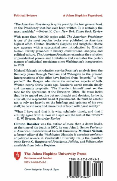 In what he terms an impressionistic rendering of the main dimensions of presidential office, Clinton Rossiter studies the powers and limitations of the presidency with especial concern for the modern presidency and its methods of functioning. He reviews roles vested in the president by the Constitution and those that have evolved upon him since, some helpful and some conflicting; considers the charges against the office (the problems raised by the relation of president to Congress, the lack of continuous responsibility for each act as in the British setup, the combination of power and independence seen by some as a matrix for dictatorship), and the limiting factors, foremost being Congress, which might be observed for similar uses of power. The author turns his hand to dealing in greatness of presidents as he sets forth the history of the office by outstanding incumbents from Washington, who assured its being by his dignity and adherence to the Constitution (and by the conception of a presidency on his merits) to Eisenhower - with close inspection of the last three holders of office (at this reading the Eisenhower section presupposes he will not run again). Stimulating commentary particularly in view of judgments on men, this concerns itself more with the functions of office and incumbents than The Presidency Today by Corwin and Koenig (see review, p. 144 February 15, 1956 Bulletin) and while covering much of the same ground, is less outstanding than the latter in clarity of historical conception and handling of certain elements such as the election and succession of the president. (Kirkus Reviews)
