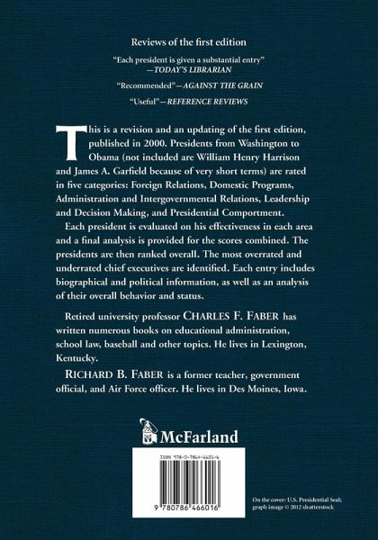 This is a revision and an updating of the first edition, published in 2000. Presidents from Washington to Obama (not included are William Henry Harrison and James A. Garfield because of very short terms) are rated in five categories: Foreign Relations, Domestic Programs, Administration and Intergovernmental Relations, Leadership and Decision Making, and Presidential Comportment. Each president is evaluated on his effectiveness in each area and a final analysis is provided for the scores combined. The presidents are then ranked overall. The most overrated and underrated chief executives are identified. Each entry includes biographical and political information, as well as an analysis of their overall behavior and status.