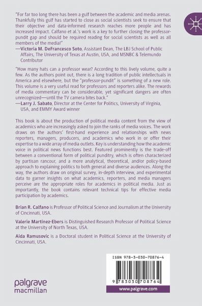 This book considers the production of political media content from the perspective of academics who are increasingly asked to join the ranks of voices charged with informing the public. The work draws on the authors' first-hand experience and relationships with media reporters, managers, producers, and academics offering their expertise to a wide array of media outlets to understand and report on the dynamics shaping how the academic voice in political news may be at its most useful. Featured prominently in the book is the trade-off between a conventional form of political punditry, which is often characterized by partisan rancour, and a more analytical, theoretical, and/or policy-based approach to explaining politics to both general and diverse audiences. Along the way, the work draws on original survey, in-depth interview, and experimental data to garner insights on what academics in media, reporters, and media managers perceive are the appropriate roles for academics featured inpolitical media. This book also contains relevant technical tips for effective media communication by academics.