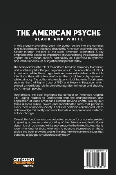 In this thought-provoking book, the author delves into the complex and intricate factors that have shaped the American psyche throughout history through the lens of the Black American experience. A key emphasis of the book is the importance of understanding the constitution's impact on American society, particularly as it pertains to systemic and institutional issues of injustice that persist today. The book examines the role of the northern American Missionary Association and northern philanthropist organizations in the education of Black Americans. While these organizations were established with noble intentions, they ultimately reinforced the racial hierarchy system of white primacy. The author also analyzes critical Supreme Court cases, such as the Civil Rights Case of 1883 and Plessy v. Ferguson, which played a significant role in perpetuating discrimination and shaping the American psyche. Furthermore, the book highlights the concept of "America's Original Sin," urging readers to understand that the marginalization and oppression of Black Americans extends beyond chattel slavery, but takes a more subtle, covert, and sophisticated form that pervades every facet of modern society. It calls for politicians and individuals to acknowledge this reality and work towards a comprehensive systemic holistic change. Overall, this book serves as a valuable resource for anyone interested in gaining a deeper understanding of the historical and institutional dynamics of racism and white supremacy in the United States. Highly recommended for those who wish to educate themselves on these topics, the book provides crucial insights into the systemic issues that continue to plague American society today.