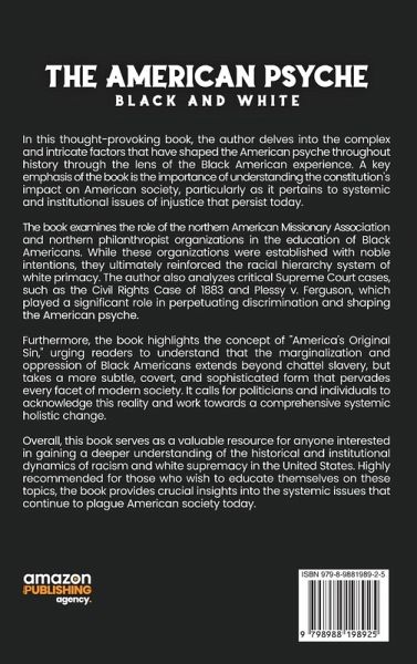 In this thought-provoking book, the author delves into the complex and intricate factors that have shaped the American psyche throughout history through the lens of the Black American experience. A key emphasis of the book is the importance of understanding the constitution's impact on American society, particularly as it pertains to systemic and institutional issues of injustice that persist today. The book examines the role of the northern American Missionary Association and northern philanthropist organizations in the education of Black Americans. While these organizations were established with noble intentions, they ultimately reinforced the racial hierarchy system of white primacy. The author also analyzes critical Supreme Court cases, such as the Civil Rights Case of 1883 and Plessy v. Ferguson, which played a significant role in perpetuating discrimination and shaping the American psyche. Furthermore, the book highlights the concept of "America's Original Sin," urging readers to understand that the marginalization and oppression of Black Americans extends beyond chattel slavery, but takes a more subtle, covert, and sophisticated form that pervades every facet of modern society. It calls for politicians and individuals to acknowledge this reality and work towards a comprehensive systemic holistic change. Overall, this book serves as a valuable resource for anyone interested in gaining a deeper understanding of the historical and institutional dynamics of racism and white supremacy in the United States. Highly recommended for those who wish to educate themselves on these topics, the book provides crucial insights into the systemic issues that continue to plague American society today.