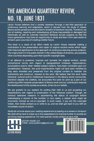 The American Quarterly Review, No. 18, June 1831 This book is a result of an effort made by us towards making a contribution to the preservation and repair of original classic literature. In an attempt to preserve, improve and recreate the original content, we have worked towards: 1. Type-setting & Reformatting: The complete work has been re-designed via professional layout, formatting and type-setting tools to re-create the same edition with rich typography, graphics, high quality images, and table elements, giving our readers the feel of holding a 'fresh and newly' reprinted and/or revised edition, as opposed to other scanned & printed (Optical Character Recognition - OCR) reproductions. 2. Correction of imperfections: As the work was re-created from the scratch, therefore, it was vetted to rectify certain conventional norms with regard to typographical mistakes, hyphenations, punctuations, blurred images, missing content/pages, and/or other related subject matters, upon our consideration. Every attempt was made to rectify the imperfections related to omitted constructs in the original edition via other references. However, a few of such imperfections which could not be rectified due to intentional\unintentional omission of content in the original edition, were inherited and preserved from the original work to maintain the authenticity and construct, relevant to the work. We believe that this work holds historical, cultural and/or intellectual importance in the literary works community, therefore despite the oddities, we accounted the work for print as a part of our continuing effort towards preservation of literary work and our contribution towards the development of the society as a whole, driven by our beliefs. We are grateful to our readers for putting their faith in us and accepting our imperfections with regard to preservation of the historical content. HAPPY READING!
