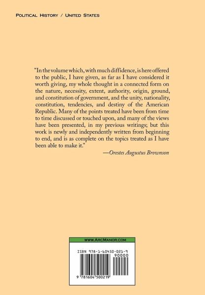 "In the volume which, with much diffidence, is here offered to the public, I have given, as far as I have considered it worth giving, my whole thought in a connected form on the nature, necessity, extent, authority, origin, ground, and constitution of government, and the unity, nationality, constitution, tendencies, and destiny of the American Republic. Many of the points treated have been from time to time discussed or touched upon, and many of the views have been presented, in my previous writings; but this work is newly and independently written from beginning to end, and is as complete on the topics treated as I have been able to make it." -Orestes Augustus Brownson