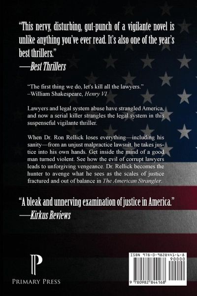 "The first thing we do, let's kill all the lawyers." -William Shakespeare, Henry VI Lawyers and legal system abuse have strangled America, and now a serial killer strangles the legal system in this suspenseful vigilante thriller. When Dr. Ron Rellick loses everything-including his sanity-from an unjust malpractice lawsuit, he takes justice into his own hands. Get inside the mind of a good man turned violent. See how the evil of corrupt lawyers leads to unforgiving vengeance. Dr. Rellick becomes the hunter to avenge what he sees as the scales of justice fractured and out of balance in The American Strangler.