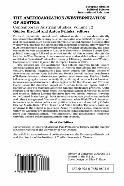 Political, economic, social, and cultural modernization dramatically transformed twentieth-century Austria. Innovative new methods of production and management, such as the assembly line, changed Austrian business after World War I, much as the Marshall Plan shaped the economy after World War II. At the same time, jazz, Hollywood movies, television programming, and mass commodities were as popular in Austria as elsewhere in Western Europe. Even political campaigns followed American trends. All this occurred despite the fact that in West Germany, American nostrums and models had been rejected, modified, or "translated" into milder versions. Ultimately, Austria was "Western Europeanized" when it joined the European Union in 1995. How Western are the Austrians? This volume analyzes trends toward Americanization and Westernization in Austria throughout the twentieth century. Reinhold Wagnleitner's lead essay studies the foreign politics of American pop culture. Anna Schober and Monika Bernold analyze the influence of Hollywood movies and television on postwar Austrian society. Reinhard Sieder follows changing discourses on family life, while Ingrid Bauer looks at American influences on Austrian women. Maria-Regina Kecht, Kurt Drexel, and Christina Hainzl follow the American impact on Austrian literature, opera, and art. Banker Anton Fink examines American banking and finance practices. Andre Pfoertner and Matthias Fuchs study the Americanization of Austrian business and tourism. Helmut Lackner describes how well-heeled Austrian travelers to the United States brought back innovative American production methods and other ideas gleaned from world expositions before World War I. American influences on Austrian politics and political science are dissected by Gunter Bischof, Martin Kofler, Fritz Plasser, and Anton Pelinka. The Americanization of Vienna is the subject of journalist Armin Thurnher's essay. Comparisons with West Germany are presented by Michael Hochgeschwender. These essays prove that "Americanization," "Westernization," and "globalization" need to be carefully defined before generalizations can be made.