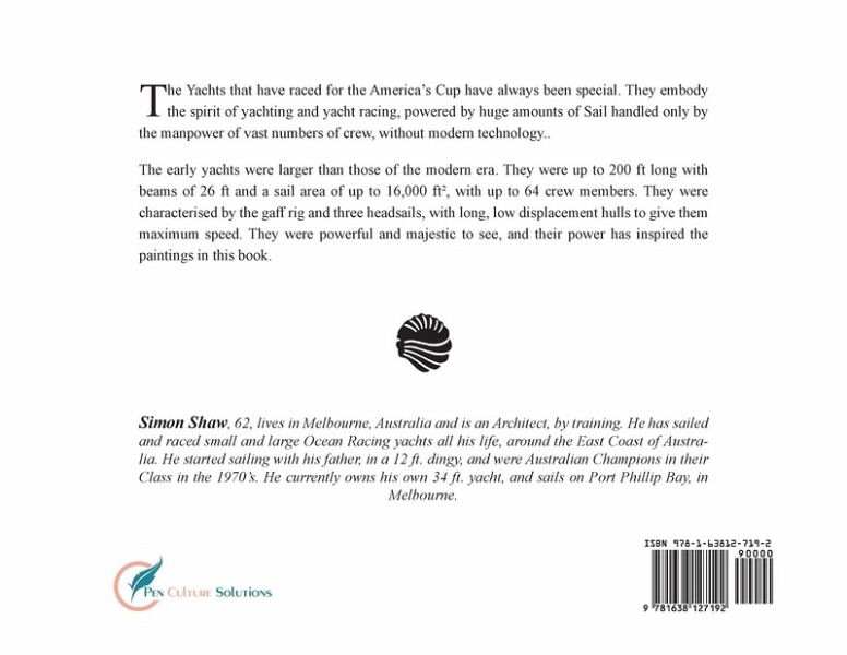 The Yachts that have raced for the America's Cup have always been special. They embody the spirit of yachting and yacht racing, powered by huge amounts of Sail handled only by the manpower of vast numbers of crew, without modern technology.The early yachts were larger than those of the modern era. They were up to 200 ft. long with beams of 26 ft. and a Sail area of up to 16,000 ft2, with up to 64 crewmembers. They were characterised by the gaff rig and three headsails, with long, low displacement hulls to give them the maximum speed. They were powerful and majestic to see, and their power has inspired the paintings in the book.