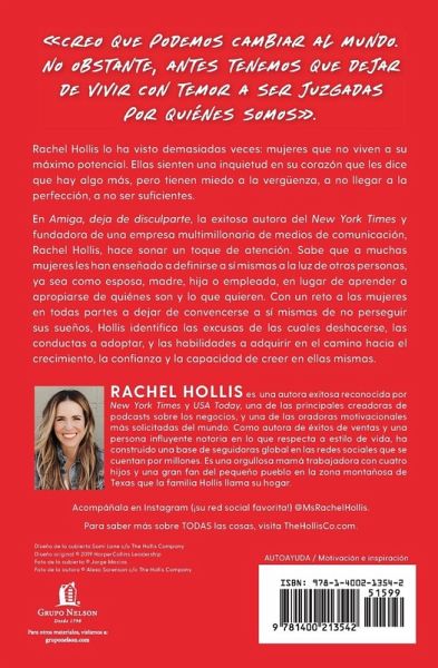 Rachel Hollis, autora del best seller Amiga, lávate esa cara y fundadora de TheChicSite.com, exhorta a las mujeres a dejar de disculparse por sus deseos, esperanzas y sueños y, en cambio, perseguirlos con pasión y confianza. Rachel ha sido testigo con frecuencia de mujeres que tienen temor de lograr sus propios objetivos. Temen pasar vergüenza, no alcanzar la perfección o no ser lo suficientemente valiosas. Pero el mayor temor de todos es ser juzgadas por el solo hecho de tener una ambición. Habiendo aprendido a definirse a sí mismas a la luz de otras personas -ya sea como esposas, madres, hijas o amigas- muchas mujeres han olvidado quiénes son en realidad y quiénes deberían ser. En este libro la celebridad emprendedora en línea, Rachel Hollis, alienta a las mujeres a ser dueñas de sus esperanzas, deseos y metas, y les recuerda que no tienen que pedir permiso para desear alcanzar más. Con un llamado a las mujeres de todo el mundo para que no dejen de hablar de sus sueños, Hollis identifica las excusas de las que tienen que liberarse, los comportamientos que deben adoptar y las habilidades que necesitan adquirir, en el camino hacia el crecimiento, la confianza y la mejor versión de sus vidas. Girl, Stop Apologizing Bestselling author of Girl, Wash Your Face and founder of TheChicSite.com Rachel Hollis urges women to stop apologizing for their desires, hopes, and dreams and instead to go after them with passion and confidence. Rachel Hollis has seen it too often: women being afraid of their own goals. They're afraid of embarrassment, of falling short of perfection, of not being enough. But the biggest fear of all is of being judged for having ambition at all. Having been taught to define themselves in light of other people--whether as wife, mother, daughter, or friend--many women have forgotten who they are and what they were meant to be. In Girl, Stop Apologizing, entrepreneur and online personality Rachel Hollis encourages women to own their hopes and desires and goals and reminds them they don't need permission to want more. With a call to women everywhere to stop talking themselves out of their dreams, Hollis identifies the excuses to let go of, the behaviors to adopt, and the skills to acquire on the path to growth, confidence, and the biggest possible version of their lives.