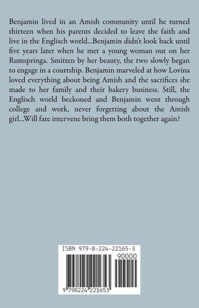 Benjamin lived in an Amish community until he turned thirteen when his parents decided to leave the faith and live in the Englisch world...Benjamin didn't look back until five years later when he met a young woman out on her Rumspringa. Smitten by her beauty, the two slowly began to engage in a courtship. Benjamin marveled at how Lovina loved everything about being Amish and the sacrifices she made to her family and their bakery business. Still, the Englisch world beckoned and Benjamin went through college and work, never forgetting about the Amish girl...Will fate intervene bring them both together again?