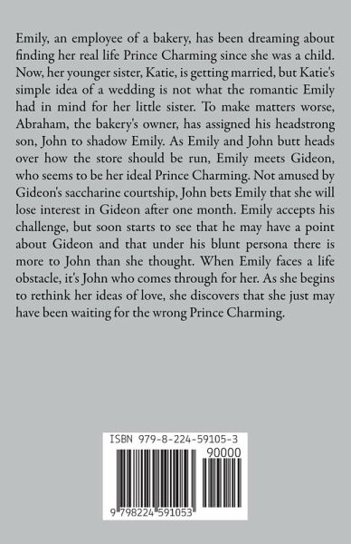 Emily, an employee of a bakery, has been dreaming about finding her real life Prince Charming since she was a child. Now, her younger sister, Katie, is getting married, but Katie's simple idea of a wedding is not what the romantic Emily had in mind for her little sister. To make matters worse, Abraham, the bakery's owner, has assigned his headstrong son, John to shadow Emily. As Emily and John butt heads over how the store should be run, Emily meets Gideon, who seems to be her ideal Prince Charming. Not amused by Gideon's saccharine courtship, John bets Emily that she will lose interest in Gideon after one month. Emily accepts his challenge, but soon starts to see that he may have a point about Gideon and that under his blunt persona there is more to John than she thought. When Emily faces a life obstacle, it's John who comes through for her. As she begins to rethink her ideas of love, she discovers that she just may have been waiting for the wrong Prince Charming.