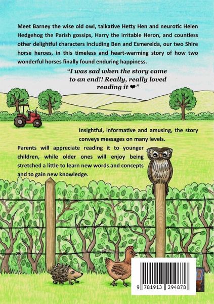 Meet Barney the wise old owl, talkative Hetty Hen and neurotic Helen Hedgehog the Parish gossips, Harry the irritable Heron, and countless other delightful characters including Ben and Esmerelda, our two Shire horse heroes, in this timeless and heart-warming story of how two wonderful horses finally found enduring happiness. "I was sad when the story came to an end!!Really, really loved reading it¿" Insightful, informative and amusing, the story conveys messages on many levels. Parents will appreciate reading it to younger children, while older ones will enjoy being stretched a little to learn new words and concepts and to gain new knowledge.
