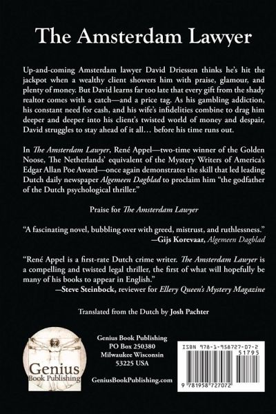 Up-and-coming Amsterdam lawyer David Driessen thinks he's hit the jackpot when a wealthy client showers him with praise, glamour, and plenty of money. But David learns far too late that every gift from the shady realtor comes with a catch-and a price tag. As his gambling addiction, his constant need for cash, and his wife's infidelities combine to drag him deeper and deeper into his client's twisted world of money and despair, David struggles to stay ahead of it all... before his time runs out. In The Amsterdam Lawyer, René Appel-two-time winner of the Golden Noose, The Netherlands' equivalent of the Mystery Writers of America's Edgar Allan Poe Award-once again demonstrates the skill that led leading Dutch daily newspaper Algemeen Dagblad to proclaim him "the godfather of the Dutch psychological thriller." "A fascinating novel, bubbling over with greed, mistrust, and ruthlessness." Gijs Korevaar, Algemeen Dagblad "René Appel is a first-rate Dutch crime writer. The Amsterdam Lawyer is a compelling and twisted legal thriller, the first of what will hopefully be many of his books to appear in English." Steve Steinbock, reviewer for Ellery Queen's Mystery Magazine