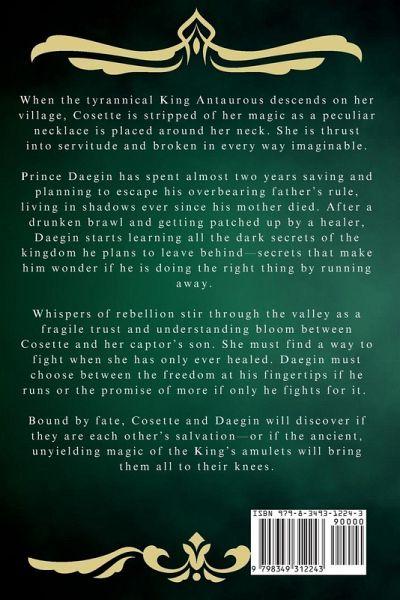 When the tyrannical King Antaurous descends on her village, Cosette is stripped of her magic as a peculiar necklace is placed around her neck. She is thrust into servitude and broken in every way imaginable. Prince Daegin has spent almost two years saving and planning to escape his overbearing father's rule, living in shadows ever since his mother died. After a drunken brawl and getting patched up by a healer, Daegin starts learning all the dark secrets of the kingdom he plans to leave behind-secrets that make him wonder if he is doing the right thing by running away. Whispers of rebellion stir through the valley as a fragile trust and understanding bloom between Cosette and her captor's son. She must find a way to fight when she has only ever healed. Daegin must choose between the freedom at his fingertips if he runs or the promise of more if only he fights for it. Bound by fate, Cosette and Daegin will discover if they are each other's salvation-or if the ancient, unyielding magic of the King's amulets will bring them all to their knees.