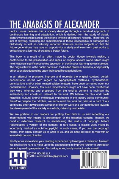 The Anabasis Of Alexander (Complete) This book is a result of an effort made by us towards making a contribution to the preservation and repair of original classic literature. In an attempt to preserve, improve and recreate the original content, we have worked towards: 1. Type-setting & Reformatting: The complete work has been re-designed via professional layout, formatting and type-setting tools to re-create the same edition with rich typography, graphics, high quality images, and table elements, giving our readers the feel of holding a 'fresh and newly' reprinted and/or revised edition, as opposed to other scanned & printed (Optical Character Recognition - OCR) reproductions. 2. Correction of imperfections: As the work was re-created from the scratch, therefore, it was vetted to rectify certain conventional norms with regard to typographical mistakes, hyphenations, punctuations, blurred images, missing content/pages, and/or other related subject matters, upon our consideration. Every attempt was made to rectify the imperfections related to omitted constructs in the original edition via other references. However, a few of such imperfections which could not be rectified due to intentional\unintentional omission of content in the original edition, were inherited and preserved from the original work to maintain the authenticity and construct, relevant to the work. We believe that this work holds historical, cultural and/or intellectual importance in the literary works community, therefore despite the oddities, we accounted the work for print as a part of our continuing effort towards preservation of literary work and our contribution towards the development of the society as a whole, driven by our beliefs. We are grateful to our readers for putting their faith in us and accepting our imperfections with regard to preservation of the historical content. HAPPY READING!