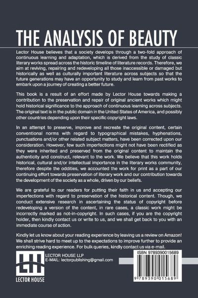 The Analysis Of Beauty: Written With A View Of Fixing The Fluctuating Ideas Of Taste This book is a result of an effort made by us towards making a contribution to the preservation and repair of original classic literature. In an attempt to preserve, improve and recreate the original content, we have worked towards: 1. Type-setting & Reformatting: The complete work has been re-designed via professional layout, formatting and type-setting tools to re-create the same edition with rich typography, graphics, high quality images, and table elements, giving our readers the feel of holding a 'fresh and newly' reprinted and/or revised edition, as opposed to other scanned & printed (Optical Character Recognition - OCR) reproductions. 2. Correction of imperfections: As the work was re-created from the scratch, therefore, it was vetted to rectify certain conventional norms with regard to typographical mistakes, hyphenations, punctuations, blurred images, missing content/pages, and/or other related subject matters, upon our consideration. Every attempt was made to rectify the imperfections related to omitted constructs in the original edition via other references. However, a few of such imperfections which could not be rectified due to intentional\unintentional omission of content in the original edition, were inherited and preserved from the original work to maintain the authenticity and construct, relevant to the work. We believe that this work holds historical, cultural and/or intellectual importance in the literary works community, therefore despite the oddities, we accounted the work for print as a part of our continuing effort towards preservation of literary work and our contribution towards the development of the society as a whole, driven by our beliefs. We are grateful to our readers for putting their faith in us and accepting our imperfections with regard to preservation of the historical content. HAPPY READING!