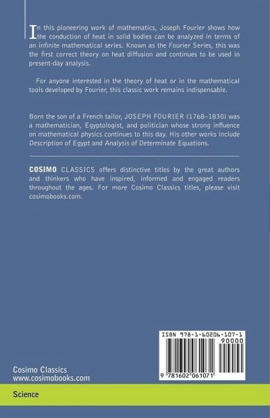 In this pioneering work of mathematics, Joseph Fourier shows how the conduction of heat in solid bodies can be analyzed in terms of an infinite mathematical series. Known as the Fourier Series, this was the first correct theory on heat diffusion and continues to be used in present-day analysis. For anyone interested in the theory of heat or in the mathematical tools developed by Fourier, this classic work remains indispensable. Born the son of a French tailor, JOSEPH FOURIER (1768-1830) was a mathematician, Egyptologist, and politician whose strong influence on mathematical physics continues to this day. His other works include Description of Egypt and Analysis of Determinate Equations.