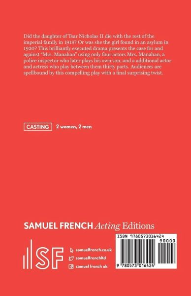 Did the daughter of Tsar Nicholas II die with the rest of the imperial family in 1918? Or was she the girl found in an asylum in 1920? This brilliantly executed drama presents the case for and against "Mrs. Manahan" using only four actors Mrs. Manahan, a police inspector who later plays his own son, and a additional actor and actress who play between them thirty parts. Audiences are spellbound by this compelling play with a final surprising twist.-2 women, 2 men