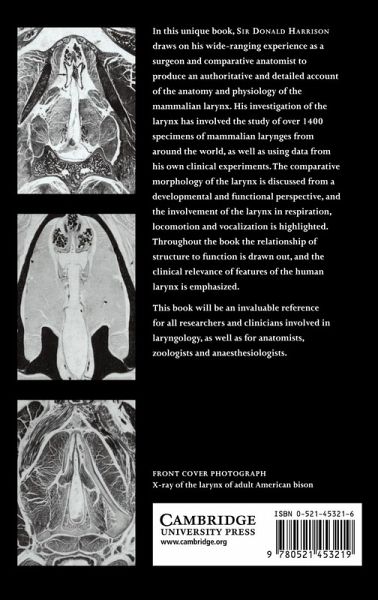 In this unique book, Sir Donald Harrison draws on his wide-ranging experience as a surgeon and comparative anatomist to produce an authoritative and detailed account of the anatomy and physiology of the mammalian larynx. His investigation of the larynx has involved the study of over 1400 specimens of mammalian larynges from around the world, as well as using data from his own clinical experiences. The comparative morphology of the larynx is discussed from a developmental and functional perspective, and the involvement of the larynx in respiration, locomotion and vocalization is highlighted. Throughout the book the relationship of structure to function is drawn out, and the clinical relevance of features of the human larynx is emphasized. This book will be an invaluable reference for all researchers and clinicians involved in laryngology, as well as for anatomists, zoologists and anaesthesiologists.
