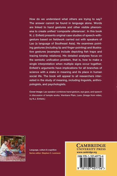 How do we understand what others are trying to say? The answer cannot be found in language alone. Words are linked to hand gestures and other visible phenomena to create unified 'composite utterances'. In this book N. J. Enfield presents original case studies of speech-with-gesture based on fieldwork carried out with speakers of Lao (a language of Southeast Asia). He examines pointing gestures (including lip and finger-pointing) and illustrative gestures (examples include depicting fish traps and tracing kinship relations). His detailed analyses focus on the 'semiotic unification' problem, that is, how to make a single interpretation when multiple signs occur together. Enfield's arguments have implications for all branches of science with a stake in meaning and its place in human social life. The book will appeal to all researchers interested in the study of meaning, including linguists, anthropologists, and psychologists.