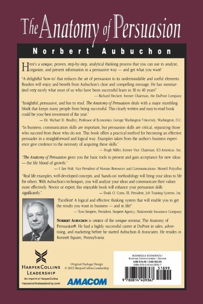 This eye-opening book will show you how the power of persuasion can help you talk to anybody about anything and get what you want from it. Some people seem able to coerce others into anything. Do they possess a natural talent that the rest of us can never hope to imitate? The Anatomy of Persuasion literally dissects each step in the persuasion process. You will turn your great ideas into tangible realities as you learn how to: apply the two major principles of communication perceive the needs of others present the features and benefits of their idea understand the subconscious decisions people often make create a logical, error-free proposal (oral or written) that will win the day The Anatomy of Persuasion provides you with a unique, proven, step-by-step analytical thinking process that anyone can use to analyze, organize, and present information in a persuasive way.