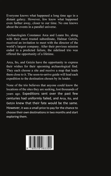 Archaeologists Constance Arca and Leann Ito, along with their most trusted subordinate, Halmar Getzin, received an invitation to meet with the director of the world's largest company. After their previous mission ended in a predicted failure, the sidelined trio was offered the opportunity of a lifetime. Arca, Ito, and Getzin have the opportunity to express their wishes for their upcoming archaeological find. They each choose a site and receive a map that leads them close to it. The soon-to-arrive guide will lead each expedition to the destina-tion chosen by its leader. None of the trio believes that anyone could know the locations of the sites they are seeking, which were lost thousands of years ago. Expeditions sent over the past few centuries had uniformly failed, and Arca, Ito, and Getzin knew that their fate would be the same. However, it was a small price to pay for the chance to choose their own destinations in two months and start exploring them.