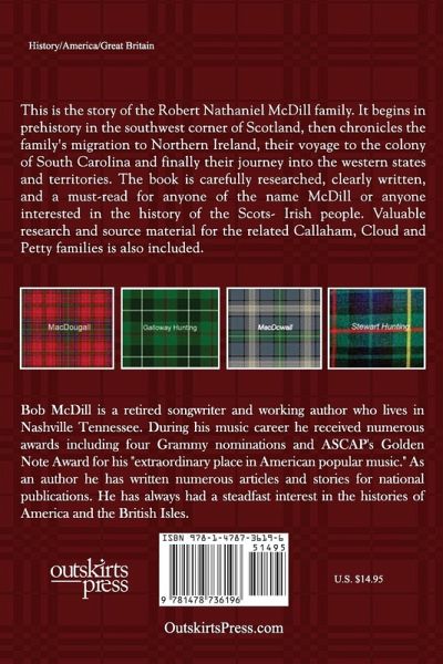 This is the story of the Robert Nathaniel McDill family. It begins in prehistory in the southwest corner of Scotland, then chronicles the family's migration to Northern Ireland, their voyage to the colony of South Carolina and finally their journey into the western states and territories. The book is carefully researched, clearly written, and a must-read for anyone of the name McDill or anyone interested in the history of the Scots- Irish people. Valuable research and source material for the related Callaham, Cloud and Petty families is also included.