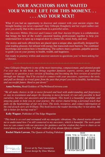 Your ancestors have waited your whole life for this moment. . . . . . and the next! What if you had an opportunity to discover and connect with your ancient origins; what if that connection brought healing you never expected possible? Amy Gillespie Dougherty and her expert author cast give you exactly that in this second book in a powerful series. The Ancestors Within, Discover and Connect with Your Ancient Origins is a collaboration that brings the best of the world's ancestral healing professionals together to help you understand how to open up a magical door to a better life, mind, body, and soul. The stories and tools offered here are placed upon a unique altar, specifically designed for your reading pleasure, but infused with energy that transcends most barriers. The combined knowledge and wisdom here is breathtaking. The genuine passion these authors have to guide you on your journey to health, wealth, and happiness is palpable. With tools that surpass DNA analysis, get ready to journey within and uncover answers to questions you've been asking for a lifetime. Grab it now!