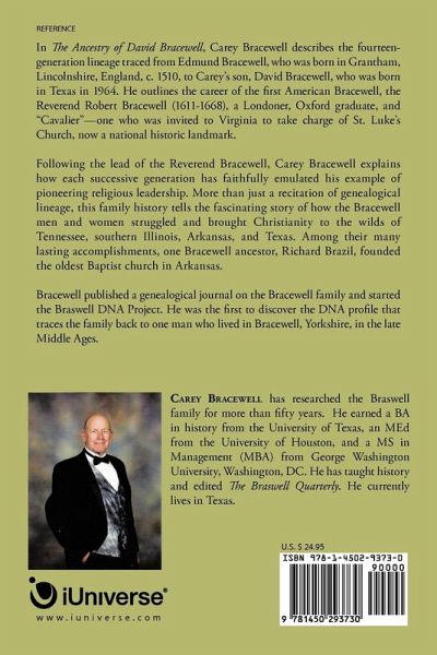 In The Ancestry of David Bracewell, Carey Bracewell describes the fourteen-generation lineage traced from Edmund Bracewell, who was born in Grantham, Lincolnshire, England, c. 1510, to Carey's son, David Bracewell, who was born in Texas in 1964. He outlines the career of the first American Bracewell, the Reverend Robert Bracewell (1611-1668), a Londoner, Oxford graduate, and "Cavalier"-one who was invited to Virginia to take charge of St. Luke's Church, now a national historic landmark. Following the lead of the Reverend Bracewell, Carey Bracewell explains how each successive generation has faithfully emulated his example of pioneering religious leadership. More than just a recitation of genealogical lineage, this family history tells the fascinating story of how the Bracewell men and women struggled and brought Christianity to the wilds of Tennessee, southern Illinois, Arkansas, and Texas. Among their many lasting accomplishments, one Bracewell ancestor, Richard Brazil, founded the oldest Baptist church in Arkansas. Bracewell published a genealogical journal on the Bracewell family and started the Braswell DNA Project. He was the first to discover the DNA profile that traces the family back to one man who lived in Bracewell, Yorkshire, in the late Middle Ages.
