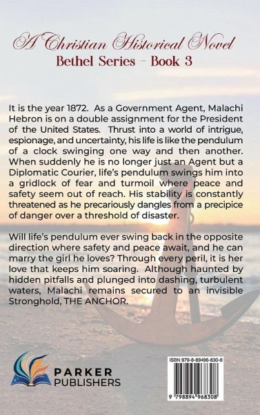 Bethel Series - Book 3A Christian Historical NovelTHE ANCHORIt is the year 1872.As a Government Agent, Malachi Hebron is on a double assignment for the President of the United States. Thrust into a world of intrigue, espionage, and uncertainty, his life is like the pendulum of a clock swinging one way and then another. When suddenly he is no longer just an Agent but a Diplomatic Courier, life's pendulum swings him into a gridlock of fear and turmoil where peace and safety seem out of reach. His stability is constantly threatened as he precariously dangles from a precipice of danger over a threshold of disaster. Will life's pendulum ever swing back in the opposite direction where safety and peace await, and he can marry the girl he loves? Through every peril, it is her love that keeps him soaring. Although haunted by hidden pitfalls and plunged into dashing, turbulent waters, Malachi trust his security and steadfastness to an invisible Stronghold, THE ANCHOR.