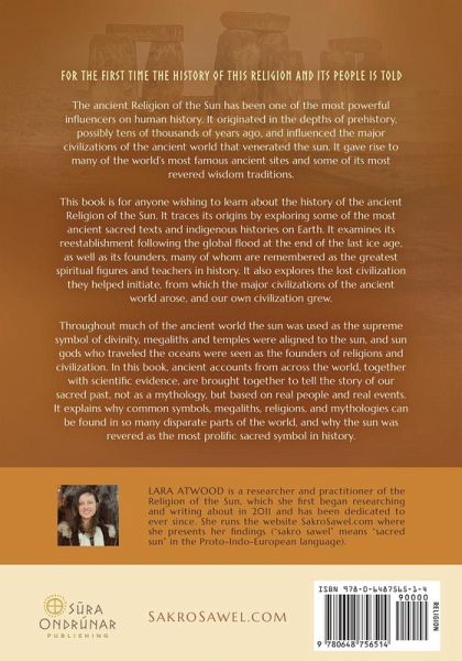 This book tells the history of what was once the world's largest religion-the Religion of the Sun. It preceded and gave rise to the great sun worshiping civilizations of Egypt, Mesopotamia, Persia, Asia, Europe, and the Americas, before being lost to history. Its vestiges remain in surviving ancient traditions, like those of Native American and European paganism, and Eastern religions such as Hinduism, where sun worship is still practiced today. In 2011, husband and wife team, Mark and Lara Atwood, embarked upon a project that would have huge implications. As Lara researched hundreds of ancient sites, texts, and myths, she and Mark discovered the beliefs, practices, and artifacts of those who worshiped the sun shared similarities-so many, and often so alike, as to be statistically out of the question to assign to coincidence. Above all, each culture had revered the sun as the highest symbol of divinity. It became inescapably clear that the great ancient civilizations of history had once shared the same religion, which had spread across the world in prehistory and branched off into many traditions over time. This is how pyramids, dynasties of sacred kings said to descend from the sun, beliefs about the afterlife centered around the stars, and a founding myth of seven sages, among many, many other things, can be found like a repeating pattern across the ancient world. Thousands of years ago, the oceans had not been barriers, but highways of currents that allowed ancient seafarers to spread the arts of civilization and their religious ideas. After more than a decade of research using archaeological, historical, linguistic, and genetic evidence from across the globe, this religion has been rediscovered, and its past reconstructed. It's the missing puzzle piece that connects the huge sun-aligned pyramids and megaliths scattered all over the world. Its existence explains why common symbols, sacred sites, and mythologies can be found in so many disparate places, and why the sun was revered as the most prolific sacred symbol in history. Since this religion had never formally been identified, it had never been given any name-so Mark and Lara called it the Religion of the Sun. This book describes its origins, rise, fall, legacy, and revival. Packed with photos and illustrations, along with quotes from ancient texts and experts, this book takes the reader on a rich, evidence-based journey through time and place. For more than two thousand years this religion has lain hidden in plain sight, but once you see it, you cannot unsee it. Its rediscovery has the potential to cause one of the biggest shifts in our understanding of history. Essential reading for those wishing to understand ancient mysteries and religion. About the author Lara Atwood is a prolific researcher and a practitioner of the Religion of the Sun, which she first began researching and writing about in 2011, and has been dedicated to ever since. She runs the website SakroSawel.com where she presents her findings ("sakro sawel" means "sacred sun" in the Proto-Indo-European language).