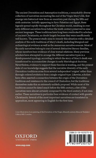 The ancient Dormition and Assumption traditions are a collection of over 60 different narratives, preserved in 9 ancient languages, that commemorate the end of the Virgin Mary's life. This study aims to make this collection more accessible by analyzing the liturgical, archaeological, and narrative sources of the earliest traditions of Mary's death. Several of the most important narratives appear here in English for the first time.