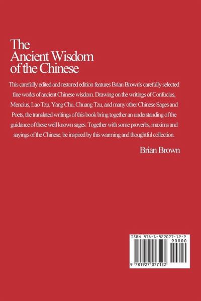 The Ancient Wisdom of the Chinese is a warm, inspiring and thoughtful collection of writings of the Chinese sages and poets together with proverbs, maxims, and sayings of the Chinese. This carefully edited and restored edition features Brian Brown's carefully selected fine works of ancient Chinese wisdom. Drawing on the writings of Confucius, Mencius, Lao Tzu, Yang Chu, Chuang Tzu, and many other Chinese Sages and Poets, the translated writings of this book bring together an understanding of the guidance of these well known sages.