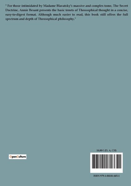" For those intimidated by Madame Blavatsky's massive and complex tome, The Secret Doctrine, Annie Besant presents the basic tenets of Theosophical thought in a concise, easy-to-digest format. Although much easier to read, this book still offers the full spectrum and depth of Theosophical philosophy." "The Ancient Wisdom" by Annie Besant - A Thorough Guide to Theosophical Teachings and Spiritual Enlightenment Discover the path to spiritual enlightenment with "The Ancient Wisdom," an insightful work by Annie Besant, a prominent theosophist of the 19th century. This profound exploration into the teachings of Theosophy, rooted in ancient wisdom traditions, offers readers an in-depth understanding of the laws and principles of the Universe, human evolution, and spiritual development. In this significant text, Besant meticulously elucidates the central tenets of Theosophy, including the spiritual hierarchy of beings, the complex structure of the human being, and the process of reincarnation. She delves into the intricate connection between humanity and the cosmos, presenting an interconnected universe where spiritual evolution is an inherent part of the cosmic order. The book further delves into the mysteries of life and death, the spiritual realms, the cycles of reincarnation, and the ultimate purpose of human existence. Besant encourages readers to engage with these profound concepts and to foster a deeper understanding of their own spiritual journey. "The Ancient Wisdom" serves as a comprehensive guide to those seeking spiritual growth, offering insight into the fundamental principles of Theosophy and providing practical guidance for spiritual development. Besant's work invites readers to venture into the realms of the metaphysical, to question, to learn, and ultimately to understand the spiritual truths of existence. Keywords: The Ancient Wisdom, Annie Besant, Theosophy, spiritual development, human evolution, reincarnation, spiritual hierarchy, metaphysical truths, spiritual enlightenment, ancient wisdom traditions, cosmic order, spiritual journey.