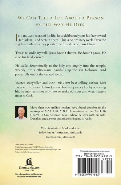 In the last week of his life, Jesus deliberately set his face toward Jerusalem---and certain death. It was no ordinary week. Even the angels were silent in the final days of Jesus Christ. Max Lucado invites you to follow Jesus on his final journey. For by observing his, you may learn not only how to make yours but also what matters most to God.