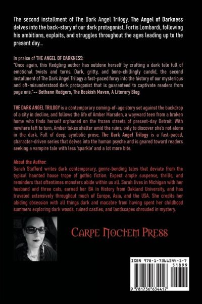 In praise of THE ANGEL OF DARKNESS: "Once again, this fledgling author has outdone herself by crafting a dark tale full of emotional twists and turns. Dark, gritty, and bone-chillingly candid, the second installment of The Dark Angel Trilogy a fast-paced foray into the history of our mysterious and oft-misunderstood dark protagonist that is guaranteed to captivate readers from page one."--Bethann Rodgers, The Bookish Maven, A Literary Blog