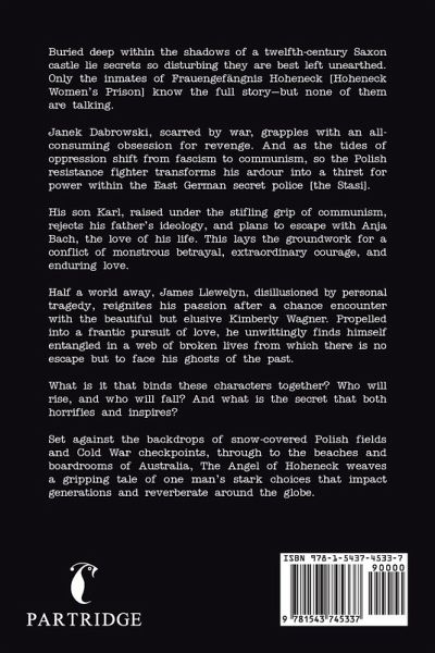 Buried deep within the shadows of a twelfth-century Saxon castle lie secrets so disturbing they are best left unearthed. Only the inmates of Frauengefängnis Hoheneck [Hoheneck Women's Prison] know the full story-but none of them are talking. Janek Dabrowski, scarred by war, grapples with an all-consuming obsession for revenge. And as the tides of oppression shift from fascism to communism, so the Polish resistance fighter transforms his ardour into a thirst for power within the East German secret police [the Stasi]. His son Karl, raised under the stifling grip of communism, rejects his father's ideology, and plans to escape with Anja Bach, the love of his life. This lays the groundwork for a conflict of monstrous betrayal, extraordinary courage, and enduring love. Meanwhile, half a world away, James Llewelyn, disillusioned by personal tragedy, reignites his passion after a chance encounter with the beautiful but elusive Kimberly Wagner. Propelled into a frantic pursuit of love, he unwittingly finds himself entangled in a web of broken lives from which there is no escape but to face his ghosts of the past. What is it that binds these characters together? Who will rise, and who will fall? And what is the secret that both horrifies and inspires them? Set against the backdrops of snow-covered Polish fields and Cold War checkpoints, through to the beaches and boardrooms of Australia, The Angel of Hoheneck weaves a gripping tale of one man's stark choices that impact generations and reverberate around the globe.