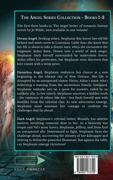 The first three books in 'The Angel Series' of romantic fantasy novels by Jo Wilde, now available in one volume! Dream Angel: Seeking solace, Stephanie Ray leaves her old life behind and starts anew in Louisiana. Little does she know that her life is about to take a drastic turn, when she encounters the enigmatic Aidan Bane. Drawn into a world of dark magic, Stephanie finds herself surrounded by malevolent forces. Aidan offers his protection, but Stephanie soon discovers that love comes with a steep price. Dauntless Angel: Stephanie embraces her chance at a new beginning in the vibrant city of New Orleans. Her life is disrupted by an unexpected visitor: Helen, Aidan's sister, who's delivering a warning from the mysterious Family. Intrigued, Stephanie embarks sets on a quest for answers, aided by an unlikely ally. In her search, Stephanie uncovers a hidden truth - the existence of others like her - but finds herself met with hostility from the celestial clan. As new adversaries emerge, Stephanie must summon her courage to confront the challenges that lie ahead. Dark Angel: Stephanie's celestial father, Mustafa, has ulterior motives involving someone dear to her. As a heavenly war erupts and Val's army leaves, Stephanie, Jeffery, and Dom find an unexpected ally. Determined to fight, Stephanie faces the challenge ahead, uncovering the identity of her kidnapper and striving to defeat the powerful Illuminati. But against the odds, can Stephanie emerge victorious?