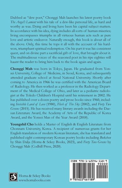 Dubbed as "dew poet," Chonggi Mah launches his latest poetry book The Angel's Lament with his tale of a dew-like personal life, as hard and worthy as was. Dying and living have been his capital subject matters. In accordance with his idea, dying includes all sorts of human miseries; living encompasses triumphs in all virtuous human acts such as pure love and artistic endeavor. Naturally enough, this book is about all of the above. Only, this time he tops it all with the account of his hard-won, triumphant spiritual redemption. On his part it was his consistent quest, and on divine part a sacrificial gift of love, that brought about it. The multitudinous voices of the seasoned poet in his ripe eighties will haunt the reader to bring him back to the book again and again. Chonggi Mah was born in Tokyo, Japan. He graduated from Yonsei University, College of Medicine, in Seoul, Korea, and subsequently attended graduate school at Seoul National University. Shortly after coming to America in 1966 he was certified with the American Board of Radiology. He then worked as a professor in the Radiology Department of the Medical College of Ohio, and later as a pediatric radiologist at the Toledo Children's Hospital until his retirement in 2002. He has published over a dozen poetry and prose books since 1960, including Invisible Land of Love (1980), Flesh of The Sky (2002), and Forty Two Greens (2015). He has received many literary awards including the Daesan Literature Award, the Academy of Arts of the Republic of Korea Award, and the Yonsei Man of the Year Award (2018). Youngshil Cho holds a Master of English & English Literature from Chonnam University, Korea. A recipient of numerous grants for her English translation of modern Korean literature, she has translated and published eight contemporary Korean poetry books including Bukchon by Shin Dalja (Homa & Sekey Books, 2023), and Forty Two Greens by Chonggi Mah (Codhill Press, 2020).