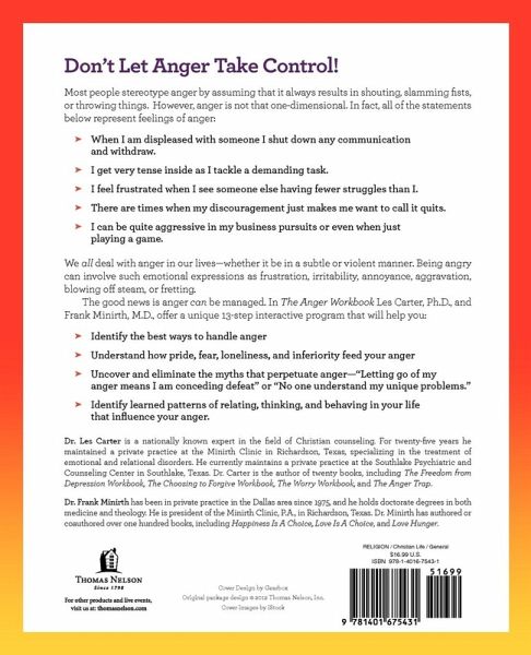 A field guide to understanding and managing anger--what it is, where it comes from, and how to get it under control. Many people assume that anger is the emotion that leads to raised voices and violence, and this kind of explosive rage is certainly a reality. But there are many different types of anger, from the simmering to the shutting down. Most of us experience some form of anger or its effects. The good news is that anger can be controlled. Founded on thirteen faith-based steps designed to recognize and manage anger, The Anger Workbook is an interactive guide to transforming patterns and behaviors with the help of biblical principles and evidence-based treatment. Best-selling author and practicing counselor Les Carter, Ph.D. and author and Christian psychiatrist Frank Minirth, M.D. draw on their years of experience and expertise to demystify the problem of anger. Throughout this workbook, you will learn: How to identify situational anger in yourself or others as well as patterns of relating, thinking, and behaving that may lead to feelings of anger How emotions like fear, loneliness, and inferiority create anger How to uncover and eliminate myths that perpetuate anger such as, "Letting go of my anger means I am conceding defeat." Or "No one understand my unique problems." For parents: how to manage a child's anger As we get to know and understand anger--whether it's our own or a loved one's--its management becomes far less daunting. Anger can be controlled.